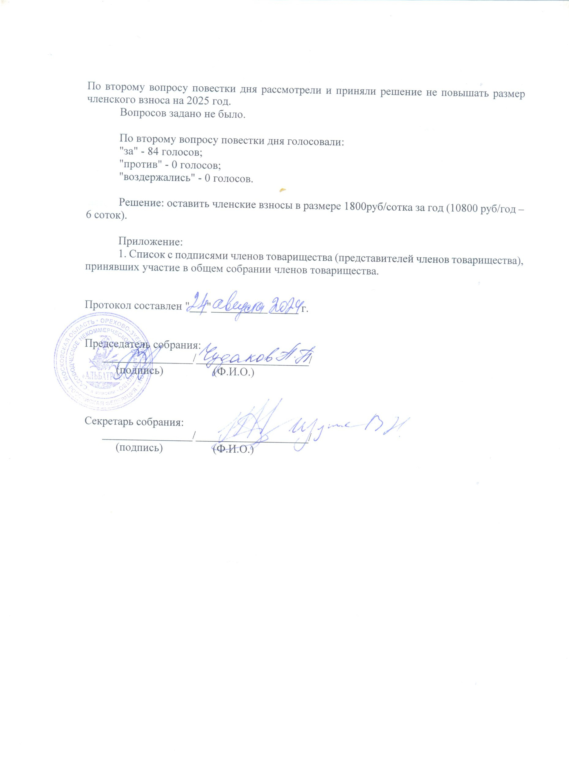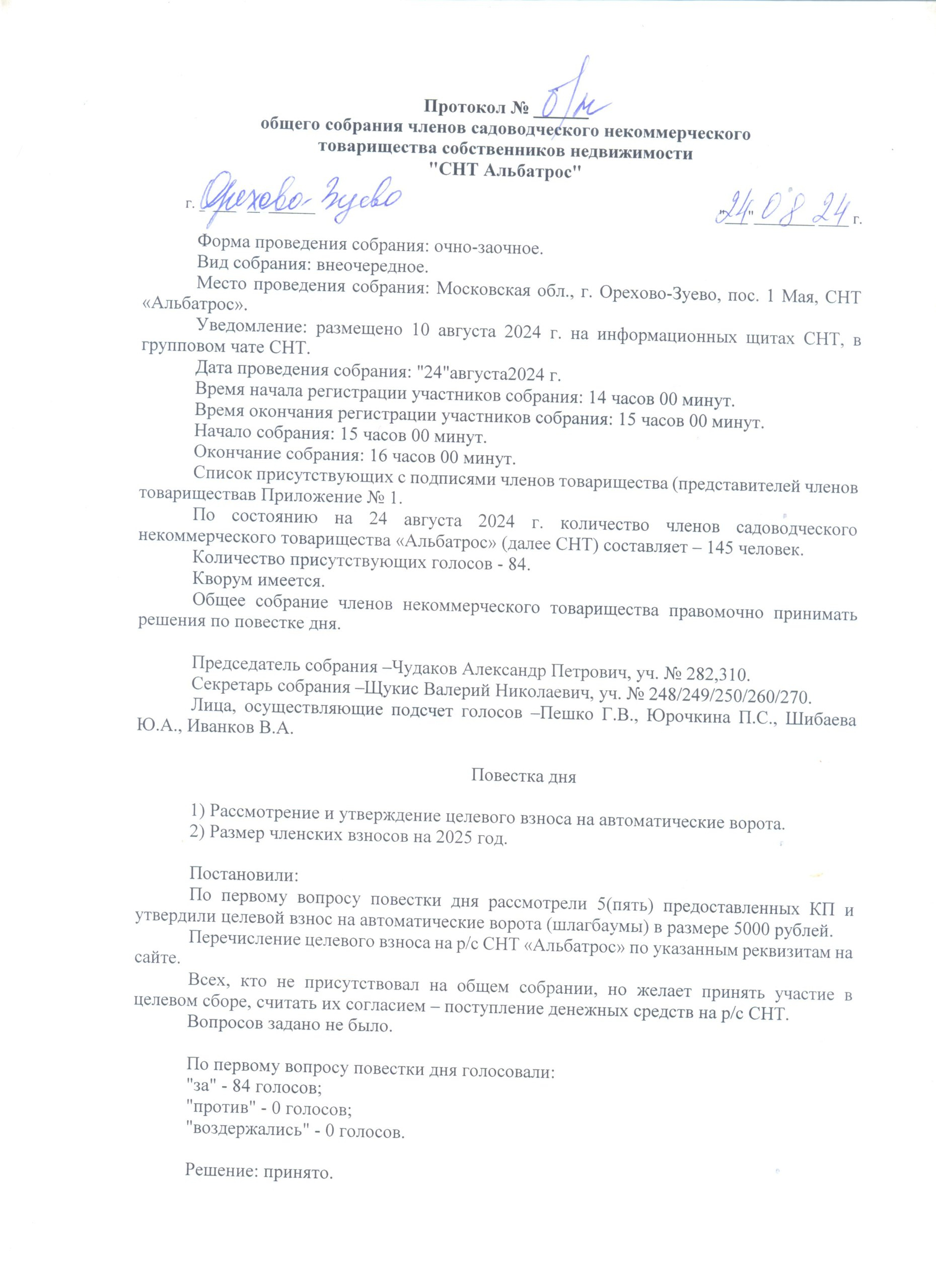 142633, Московская обл., г. Орехово-Зуево, п.1-го Мая, тер. СНТ «Альбатрос»
